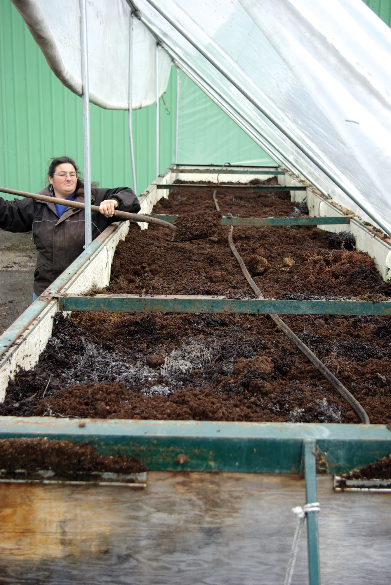 Secondly, our vermicompost is the main ingredient in our compost tea, made in 500 gallon batches on site in our microbial brew house. We regularly use the tea as a foliar spray in our greenhouses and fields. This aerobically-brewed tea, rich in microbial food, results in large populations of beneficial microorganisms. The theory goes that if compost tea has sufficient amounts of beneficial microorganisms, they will out-compete the harmful ones, leaving the disease organisms no way to attack the plant. In addition, we pump compost tea to our trial ground and seed production fields, which helps create healthy soil teaming with life.