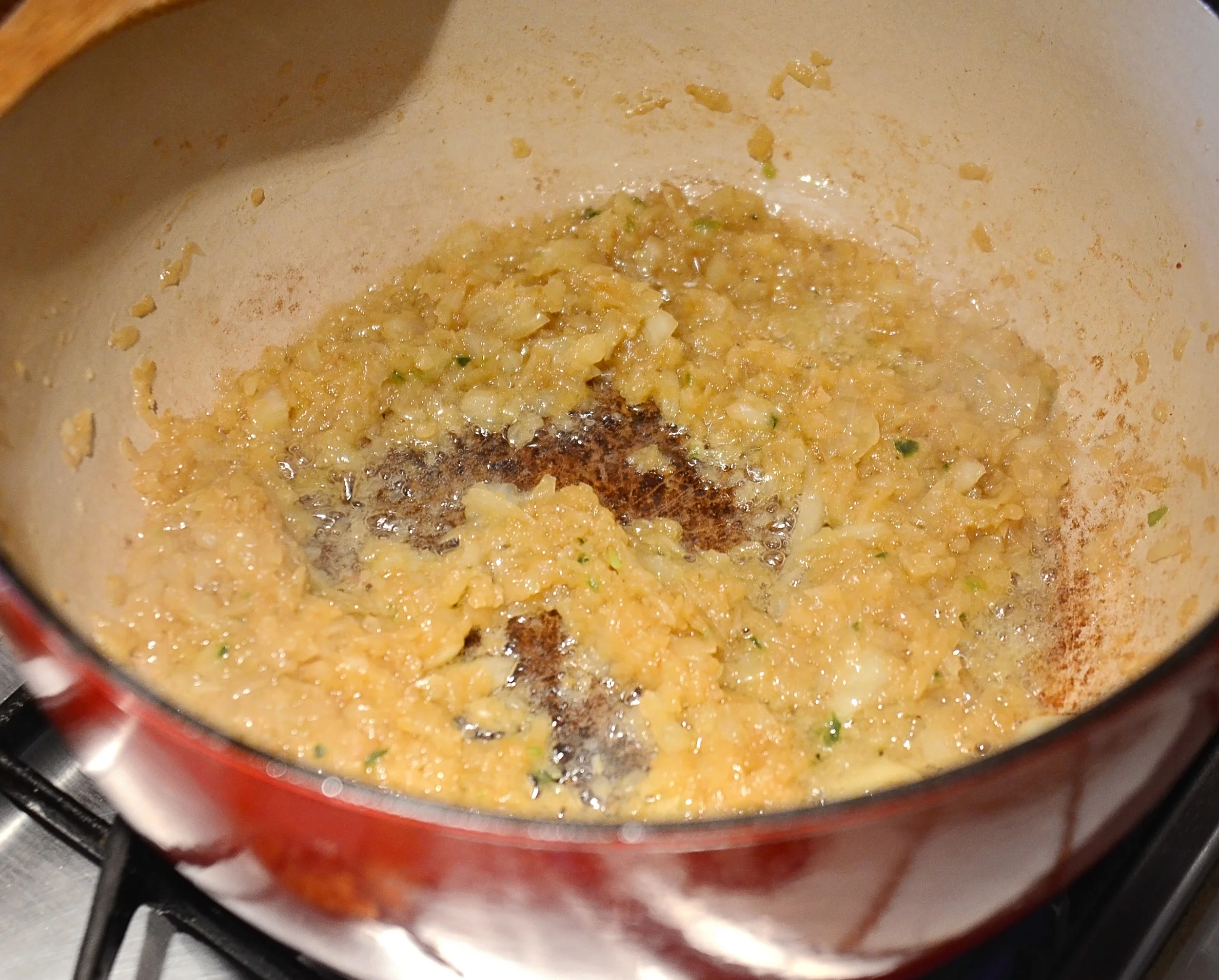 Add your finely chopped onions to the pot and caramelize on medium/low heat for about 5 minutes.