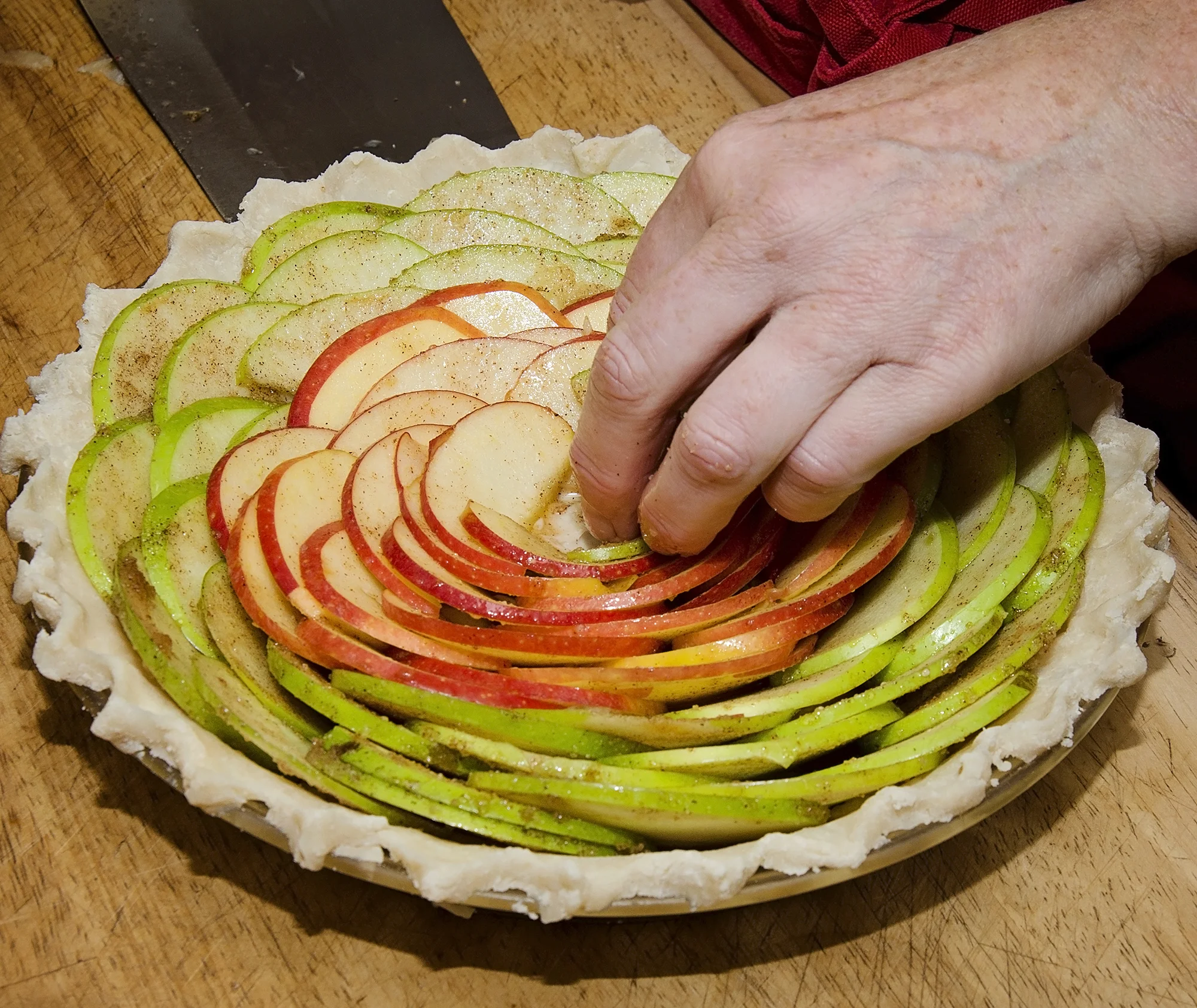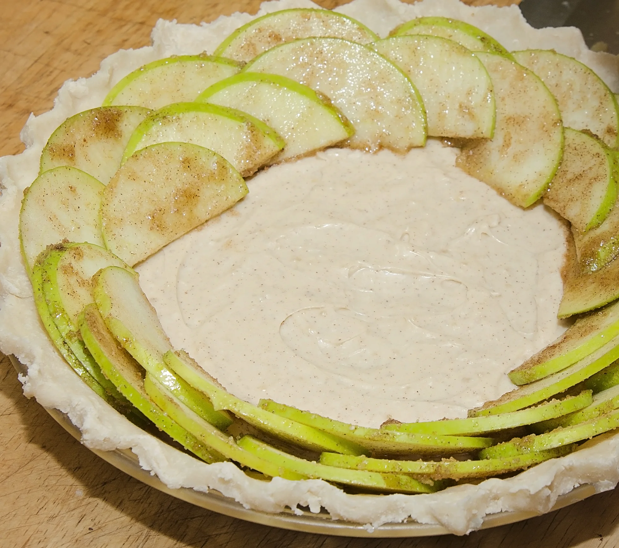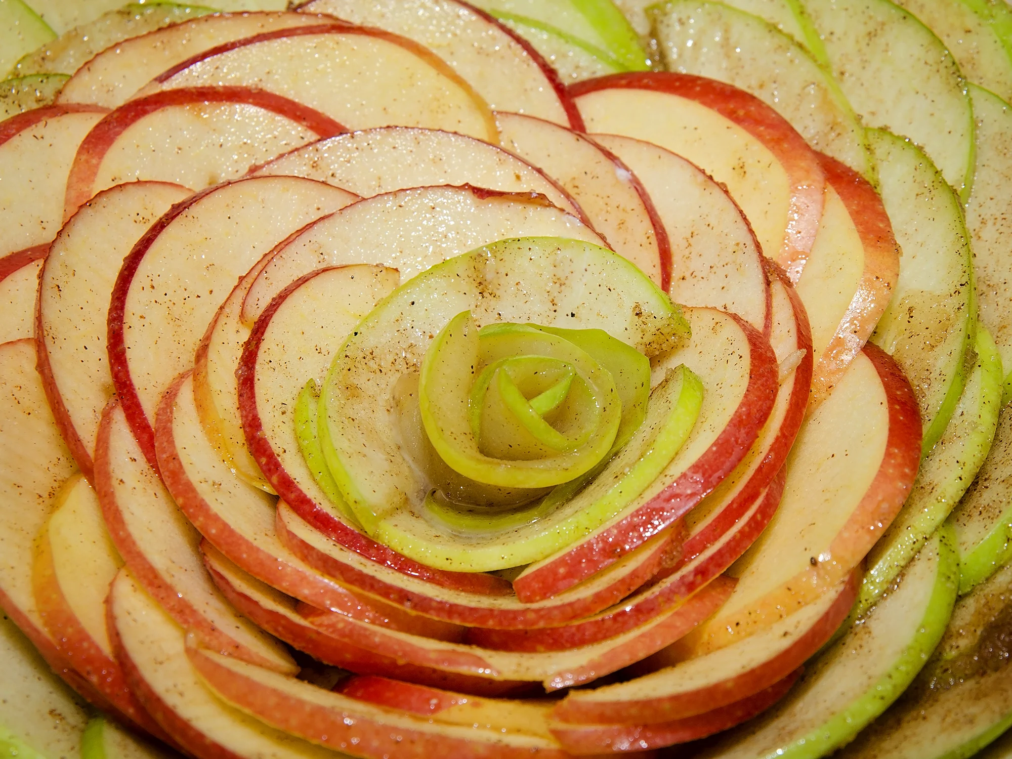 Starting at the outer edge, arrange green apple slices, overlapping slightly.