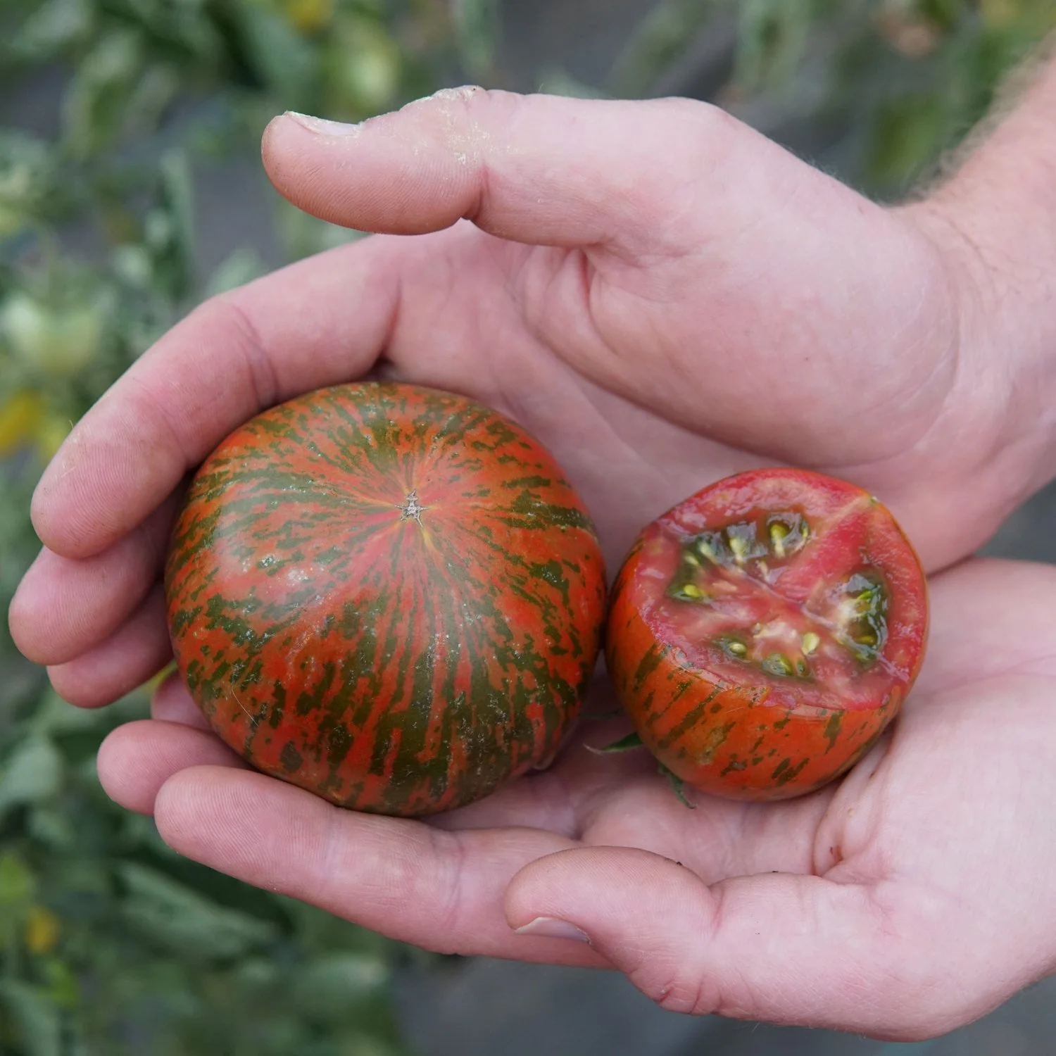 (F1) 70 days. Purple Zebra’s green-streaked, deep red skin is the first indicator that this tomato is something special. Our trials tasters unanimously agreed that it’s the best tasting new tomato we've had in years. Long, vining, indeterminate plants are very disease resistant, and the fruit resists cracking. Available as seed and transplants.